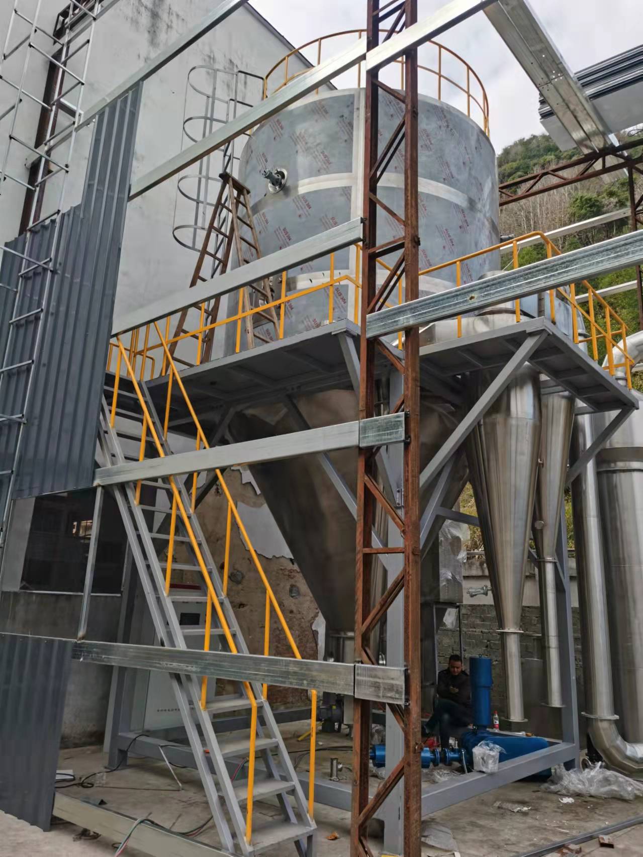 空气经过滤和加热,进入干燥器顶部空气分配器,热空气呈螺旋状均匀地进入干燥室。料液经塔体顶部的高速离心雾化器,(旋转)喷雾成极细微的雾状液珠,与热空气并流接触在极短的时间内可干燥为成品。成品连续地由干燥塔底部和旋风分离器中输出,废气由风机排空。