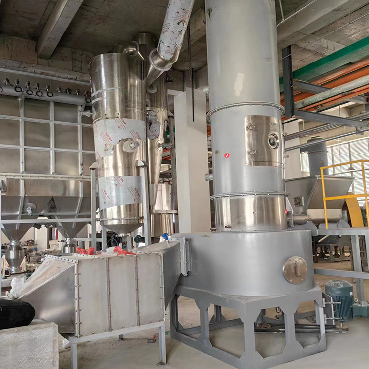 热空气切线进入干燥器底部,在搅拌器带动下形成强有力的旋转风场。膏状物料由螺旋加料器进入干燥器内,在高速旋转搅拌桨的强烈作用下,物料受撞击、磨擦及剪切力的作用下得到分散,块状物料迅速粉碎,与热空气充分接触、受热、干燥。脱水后的干物料随热气流上升,分级环将大颗粒截留,小颗粒从环中心排出干燥器外,由旋风分离器和除尘器回收,未干透或大块物料受离心力作用甩向器壁,重新落到底部被粉碎干燥。